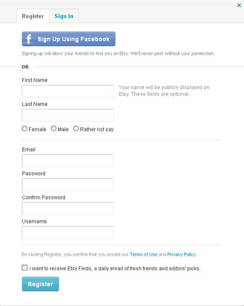 The first step in setting up a shop on Etsy is to register for an account. This is simple process, and looks the same as most website sign-ups. To start this process, click here. Remember that setting up an Etsy account does not mean you’ve set up a shop. This account is the first step in setting up an online storefront. Â To learn more about setting up shop, read on!