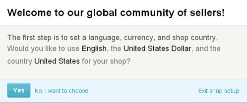 Once you’ve decided to open your first Etsy shop, it will ask you about your preferred language and currency. Go ahead and choose which ones work the best for you. Remember that whichever language you chose will be your shop’s default and you won’t be able to change it at a later point. Also, be sure to pick the correct country for your business as some Etsy seller tools are only available for certain countries.