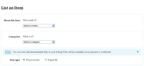 - Digital Goods. Are you selling a PDF to go with your project? Or even cute custom labels that you worked on to go with that special holiday set? Etsy now offers a way to sell these items as well. To list a digital item for sell start by going to your shop as you woulds normally do when selling a physical item. Describe the item and use the drop down menus to identify the type of product it is. Once you’ve finished that, you will have a chance to select the item type of the product, make sure that the Digital File option (below) is selected.