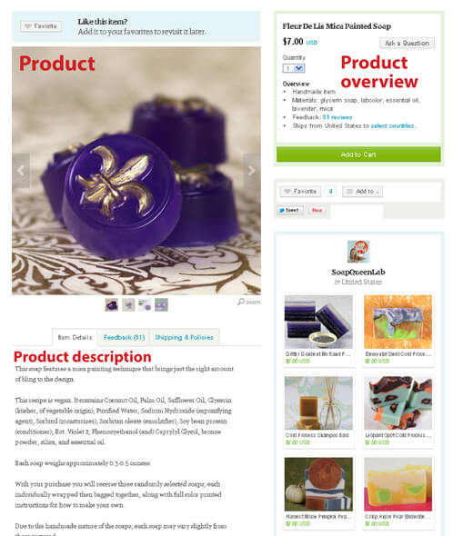 This is an individual product listing. It gives the name of the product, the price, the quantity and details about it (materials, ingredients, etc). The more information you list on a product the more likely a customer is to buy it. Â You will want to include a full ingredient list so that potential customers will know exactly what they are getting. One thing to remember about listing an item on Etsy is a listing fee. To list an item on Etsy, it costs $0.20 (twenty cents) when the listing is published. A listing will last for four months or until the item is sold. If after four months the item has not been sold, then the listing will expire. This is something important to remember when adding products to your Etsy shop.