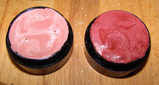 This is Merlot Mica with titanium dioxide (left) and without (right). Both are very different look on the lips. Notice also the air bubbles in the titanium dioxide lipstick on the left? This is easily solved with a hit of the heat gun. A heat gun can be purchased in the hardware store in the paint stripping section.