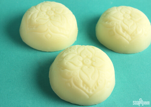 Scented with Sandalwood Vanilla Fragrance Oil, these lotion bars leave a warm, creamy and slightly spicy scent on the skin (don’t use too much, or it can smell a littler perfume-y). The Batik Dome Flexible Mold results in an intricate design, and releases the bars easily. Simply apply the bar directly to the skin, and massage in to help absorb.