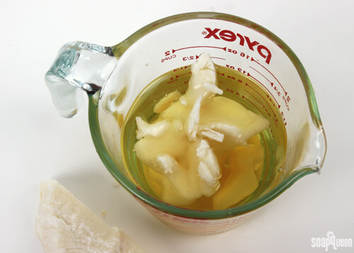 TWO: Cut the mango and cocoa butter into small pieces and add to the hot oil mixture. Cutting the butters into small pieces before adding helps melt the butters easily.