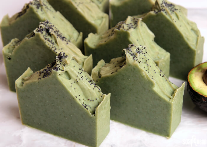 This all natural Avocado and Spearmint Soap is made with real avocado, spearmint essential oils and French green clay. Adding fresh fruit and vegetable purees to cold process soap has long been a staple in the soapmaking community. Purees can add color and skin-loving properties to the bar. In addition, purees are great from a marketing standpoint. One of my favorite purees for cold process soap is avocado. It gives the soap a luxurious feeling. Unlike some additives, avocados do not contain a large amount of sugar. Adding sugars (like those found in fruit) to cold process soap can cause excess heat, which can make the soap difficult to work with. For example, adding honey can cause an extreme gel phase, as seen in the Adding Honey to Cold Process Soap blog post.