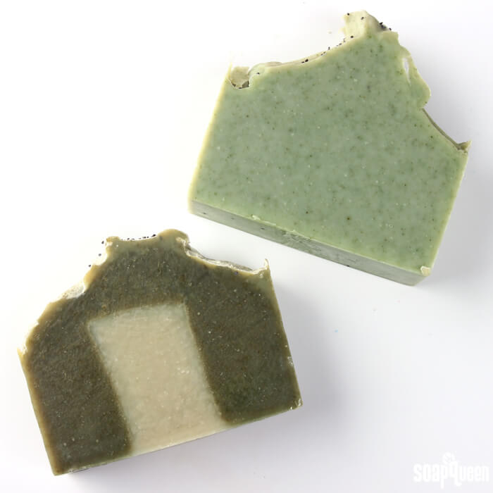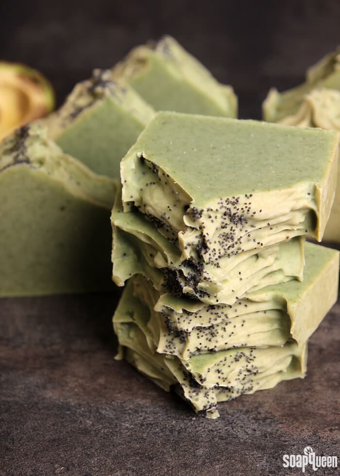 For this recipe, I added a full 3 ounces of avocado pulp, in addition to French green clay and spirulina powder for color. Spearmint essential oil gives these bars a crisp and refreshing scent. After achieving a nice thick texture, I mounded the top of the soap toward the center, created texture and sprinkled poppy seeds on top for decoration. I decided to place this soap into the fridge to prevent gel phase. The additional water from the avocado and clay + heat causes glycerin rivers. Believe me…it happened! You can see my first batch of this soap without a water discount and after gel phase at the bottom of this tutorial. Learn more about glycerin rivers and how to prevent them in this post.