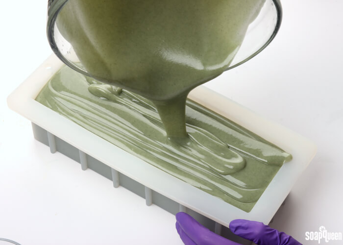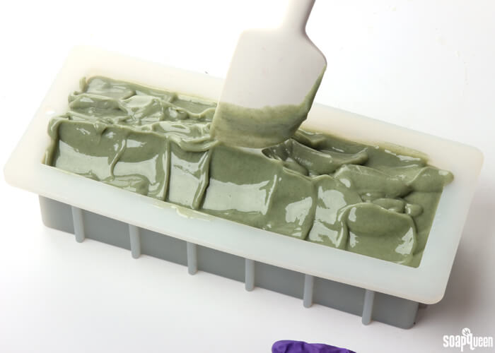 Avocado puree in cold process soap adds skin loving oils.French green clay and spirulina give this project a light green color.FOUR: Stick blend the additives into the soap until completely smooth. Add the spearmint essential oil, and stick blend using short pulses until incorporated. You don’t need to worry too much about the batter becoming thick. In fact, you want a nice thick trace! But, the soap still needs to be workable.