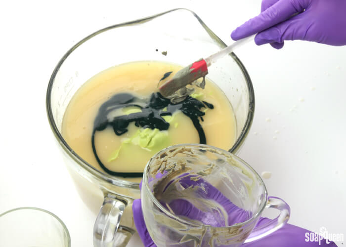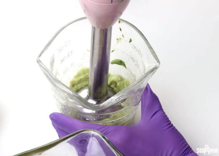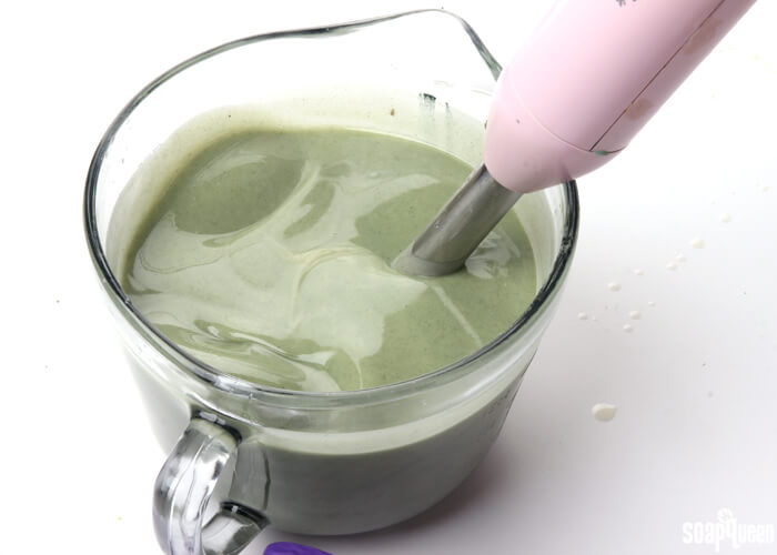 • Stick blend the additives into the soap until completely smooth. Add the spearmint essential oil, and stick blend using short pulses until incorporated. You don’t need to worry too much about the batter becoming thick. In fact, you want a nice thick trace! But, the soap still needs to be workable.