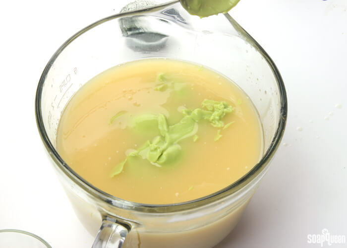 Adding avocado puree ONE: Slowly and carefully add the lye to the water and gently stir until the lye has fully dissolved and the liquid is clear. Set aside to cool.