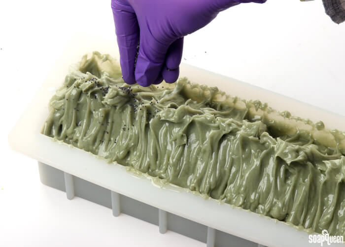 • Once you’re happy with the top, sprinkle poppy seeds in the center of the peak. Spritz the top of the soap with 99% isopropyl alcohol to avoid soda ash. Then, place the soap in the fridge or freezer for 4-24 hours. Doing so will help prevent gel phase and glycerin rivers. Remove from the fridge and allow the soap to harden in the mold at room temperature for 3-4 days. Unmold, and cut into bars.