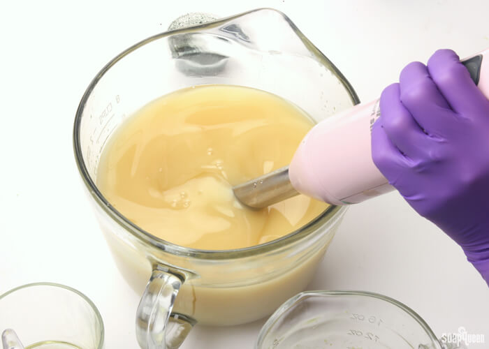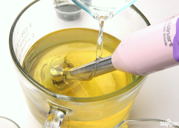 • Slowly and carefully add the lye to the water and gently stir until the lye has fully dissolved and the liquid is clear. Set aside to cool.