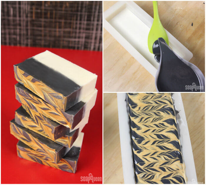 Basic layers are a great technique to master. Layers require an understanding of trace, and how thick soap is able to support soap on top. It’s best to reach a thick trace for bottom layers and allow top layers to be thinner. If soap is too thin on the bottom, the top layer may fall through and break the even layers. A great example of this technique is theĀ Black White and Gold All Over Cold Process, which features contrasting black and white layers. To help make sure the top layer of soap does not break through to the bottom, soap is poured over a spatula to “flood” the concentrated pour of soap.