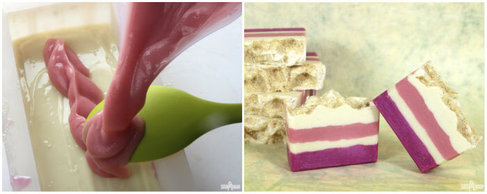 Another example of the layering technique is in the Layered Lilac Loofah Cold Process tutorial. In this project, an accelerating fragrance oil is used to create thick textured soap for each layer. When all the layers are thick, the chance of the top layers breaking through is greatly decreased. This project is perfect for learning how to work with acceleration. If you attempt the Layered Lilac Cold Process tutorial, be ready to move fast during this project; soap that has become too thick is hard to smooth evenly throughout the mold.