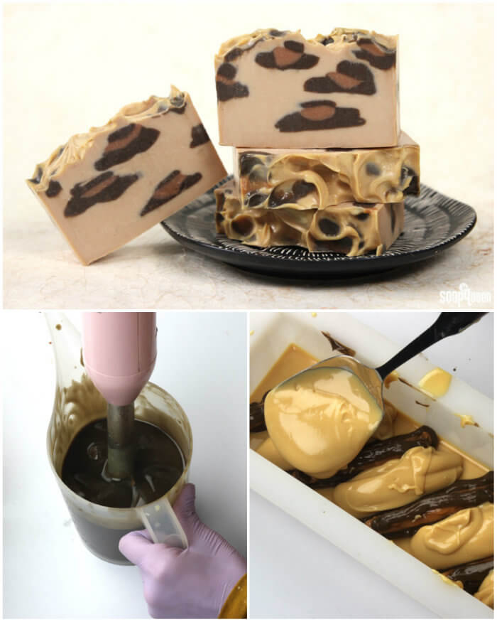 Working with thick trace is great for intermediate soapers because it gives plenty of time to work. The leopard spot print in the Wild Leopard Print Cold Process looks difficult to achieve, but it’s surprisingly simple! The key is to stick blend each color to a thick trace. The soap should be thick enough to hold its shape when piped out of disposable frosting bags.