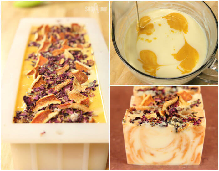 If you love the In-the-Pot Swirl, check out theĀ Juicy Orange & Sweet Rose Cold ProcessĀ tutorial. This project uses natural colorants and 10X Orange Essential Oil to create a bright and cheery bar. Rose petals and orange peelĀ are placed on top for texture.