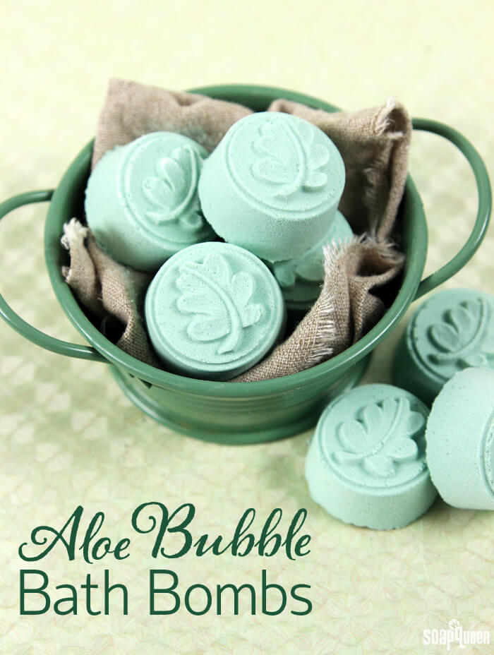 Regular bath fizzies are super fun, but if you’re looking for bubbles that stick around, these Aloe Bubble Bath Bombs are what you want. The addition of SLSA to the basic bath bomb formula of baking soda and citric acid creates silky and luxurious bubbles. Aloe extract adds skin soothing and moisturizing properties. Kentish Rain Fragrance Oil gives the bath bombs a fresh scent.