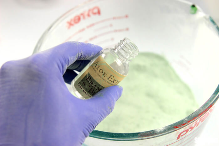 - Once the color is mostly mixed into the powders, add the aloe extract. Use your hands to mix in the extract thoroughly. You will find that the additional moisture helps mix in the color as well.