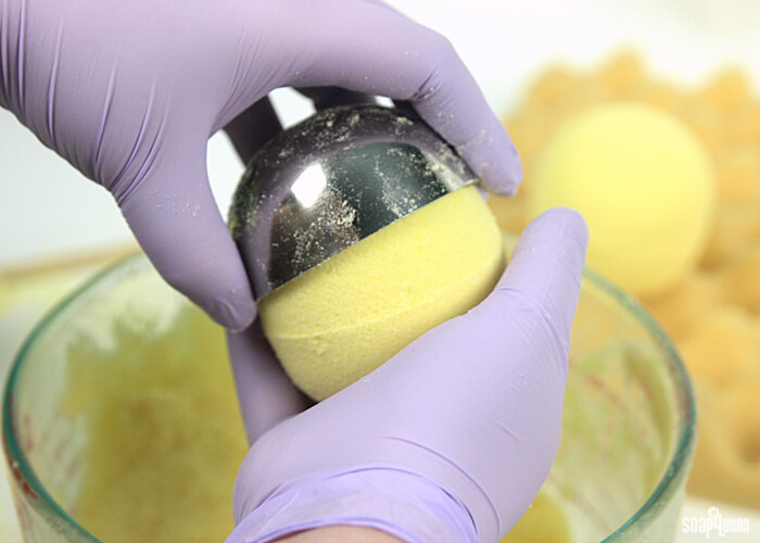 - Slowly remove the bottom half of the mold and set the bath bomb aside.