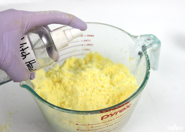 - Check the moisture level of your fizzies. The mixture should be wet enough so when you squeeze the powder in your palm it will stick together. If it doesn’t hold its shape, spritz with witch hazel. You want to spray enough so that the powders stick together and aren’t crumbly. Be careful though, because spraying too much can cause the mixture to fizz prematurely and ruin your fizzies. How much witch hazel you use depends on a number of factors, including the humidity in your area. We used about 10-12 spritzes of witch hazel.