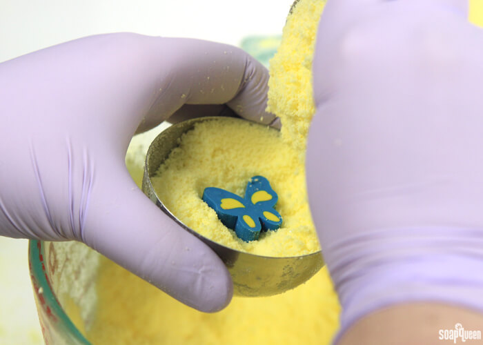 - Fill up one half of the mold with the mixture, leaving space at the top. Make sure to press the mixture in to make it compact as possible. Add 1/4 tsp. of glitter and one butterfly eraser.