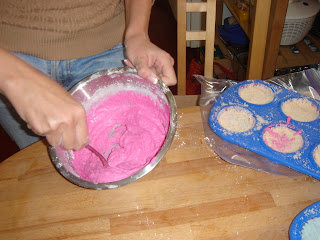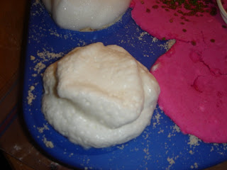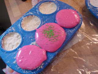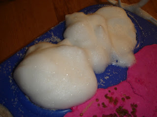 Frosting One used Meringue Powder, Water, and Arrowroot Powder. It looked too watery. I tossed in some SLS and La Bomb colorant to make Frosting Two.