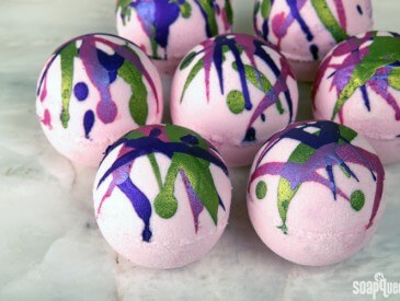 Looking for a way to jazz up your bath bombs? The mica painting technique on these Painted Berry Bath Bombs is the ticket! Once the bath bomb is fully hardened in the mold, mix mica with 99% isopropyl alcohol and start decorating. To create the paint splatter effect, I used a dropper to drizzle the “mica paint” in various directions and layers. There are so many design possibilities with the mica paint technique. Check out the Peppermint Candy Bath Bomb Tutorial to see how mica paint is used to create peppermint candy details.