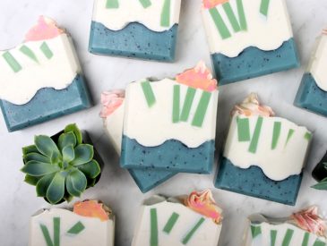 This beautiful photograph led us in designing the colors, layers, and textures of this soap. The first layer is created using Bright Blue Jean Colorant, with poppy seeds to mimic the texture of a cactus. An activated charcoal line separates the white and blue layers. Finally, green melt and pour embeds and soap “flowers” add color and interest.
