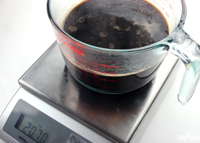 Once the beer is done boiling, weigh the beer to see how much weight was lost. In this case, I was left with 20.7 ounces. The recipe calls for 21.5 ounces of liquid. The volume and weight measurements matched up so I decided to consider the amount missing as a small water discount. If you prefer to work with the full amount of liquid, add distilled water to your boiled beer to get the correct amount. Once the beer has been boiled, refrigerate it uncovered, overnight, to be sure that it loses as much alcohol and carbonation as possible. You may also choose to freeze the liquid and add the lye to the frozen beer.