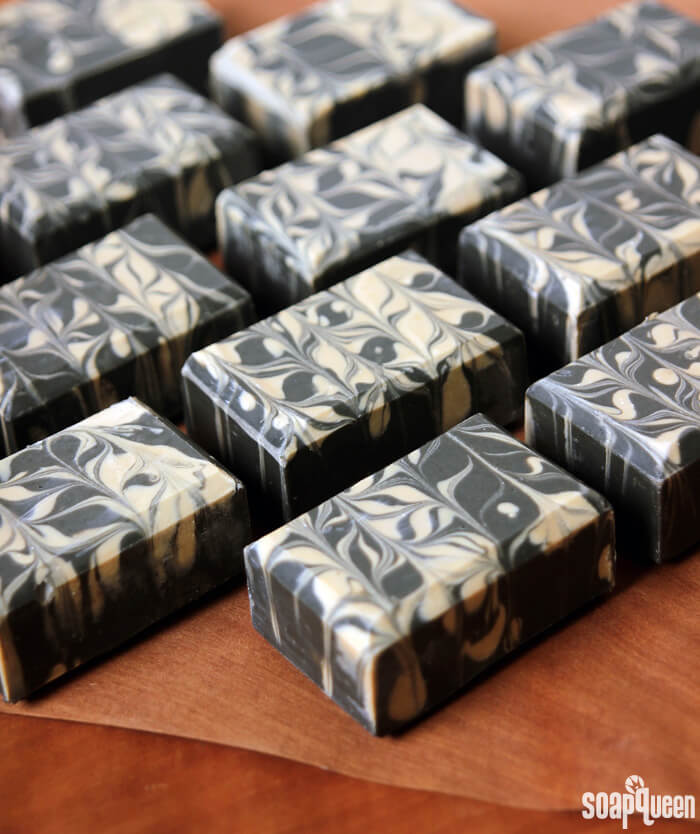 For this project, activated charcoal and titanium dioxide are used to create a rich contrasting swirl. Due to the amount of charcoal, the lather of these bars is slightly gray, but I think they are worth it. You can always lessen the amount of charcoal to do away with the gray lather. =) The blend of cedarwood essential oil and fir needle essential oil is incredibly earthy and masculine. To help combat the acceleration that alcoholic beverages can cause in cold process soap, this recipe is palm oil free. To give the bars hardness, I added cocoa butter and coffee butter. Despite the butters, this is a soft recipe and will require extra time in the mold. I highly recommend using sodium lactate in this recipe to help the bars firm up in a timely manner.