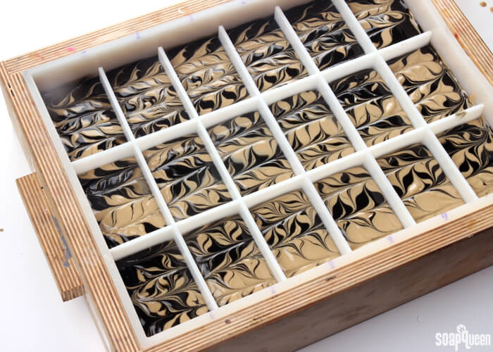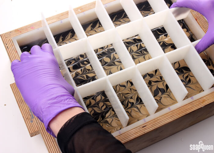 - Insert the dividers into the soap. Spritz the top of the soap with 99% isopropyl alcohol to help prevent soda ash. Allow this soap to harden in the mold for about 5 days before unmolding. Because this recipe is palm oil free and contains a lot of liquid oil, it may require more time to harden in the mold. Once ready to unmold, gently remove from the dividers and allow to cure for 4-6 weeks. Enjoy!