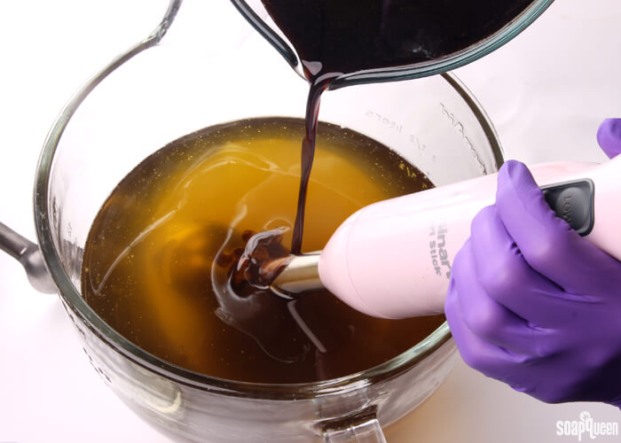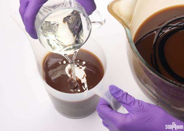 - Pour about 600 mL of the soap batter into a separate container. To this small container, add 1 tablespoon dispersed titanium dioxide and use a whisk to blend in the colorant.
