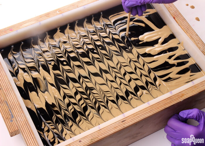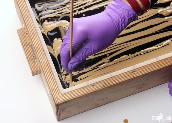 - Insert a dowel or chopstick into the very top of the soap, and drag it back and forth in the opposite direction of the cream soap lines using a S-shaped curve. Continue this pattern down the mold, until you reach the other end.