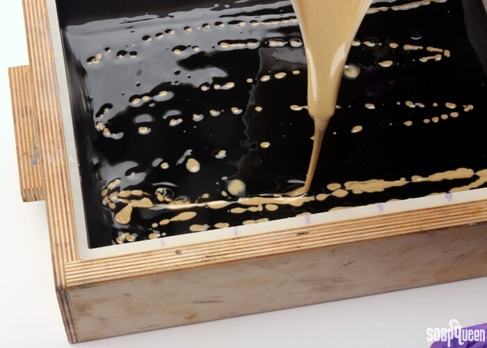 - Begin to pour the cream-colored soap across the length of the mold, going back and forth. For the first few pours, don’t worry if the soap breaks through into the black. After the first few initial passes, pour more gently into the soap to ensure the cream soap is staying on top of the black. Continue to pour in the same lengthwise direction until all the cream soap has been poured.