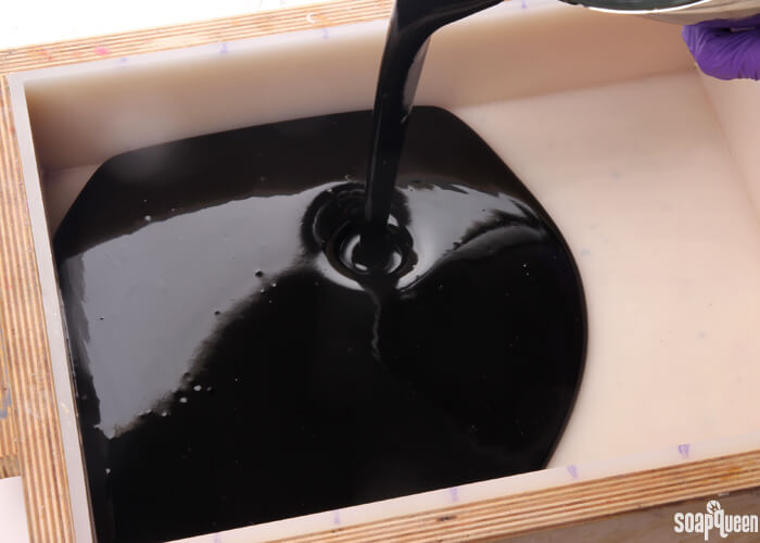 - Pour all of the black soap into the mold, and tap the mold firmly on the counter to help eliminate bubbles.