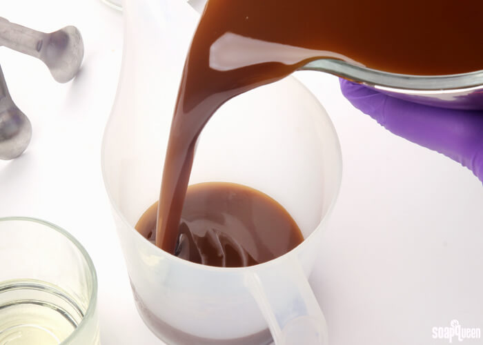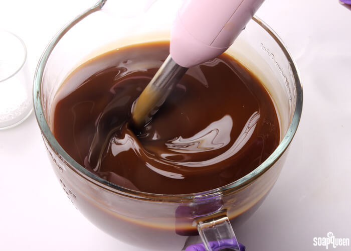 - Melt and combine the coconut oil, cocoa butter, coffee butter and olive oil. Once the lye water and the oils have cooled to 130 degrees or below (and are ideally within 10 degrees of each other), add the lye water to the oils and stick blend until a very thin trace. If you’d like a harder bar of soap that releases faster from the mold, you can add sodium lactate to the cooled lye water. Use 1 teaspoon of sodium lactate per pound of oils in the recipe. For this recipe, you’d add about 4 teaspoons sodium lactate.