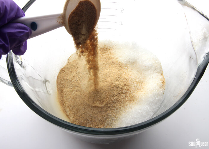 - Add the liquid soap mixture to the dry ingredients and stir until completely combined. If you prefer a more liquid scrub, feel free to add more Liquid Soap Concentrate or olive oil.