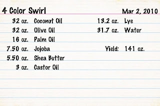 18. I’m not really wedded to any one formula. I’m super lucky that I work at Bramble Berry so I have any and every oil at my disposal so I can try different recipes. In fact, the one above, I did at a 2% superfat and then at an 8% superfat to see what I thought of the soap when it cured out. It’s just about cured so I’ll have to go do those experiments soon! =)