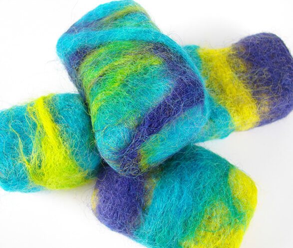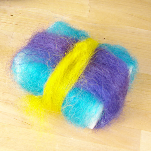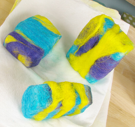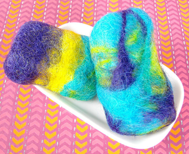 Thanks for all of the color suggestions for my wool. After switching back and forth several times I finally decided on Tropical Purple and Canary Labcolors to go with my Brilliant Blue. If you have not dyed your wool yet, see last week’s post on “Sheep Thrills“. Also, I strongly recommend felting cold process soap. It’s a harder bar that generally lasts a little bit longer than melt and pour. Learn how to make Cold Process on Soap Queen TV or buy Finished Cold Process Soap at Bramble Berry.