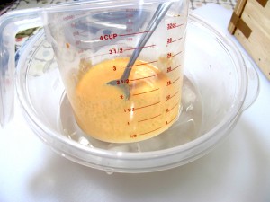 The next step is to make the lye solution. The milk doesn’t have to be frozen solid but should be nice and slushy. Weigh out 8 oz of slushy milk and add the 2.5 oz of pureed carrots.