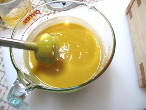 Measure out the olive oil, coconut oil and melt. Usually I don’t heat olive oil…I’ll add it to melted solid oils and butters. Add your lye solution to the heated oils and stickblend until you reach trace. Be prepared, this recipe may trace quickly!