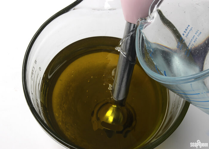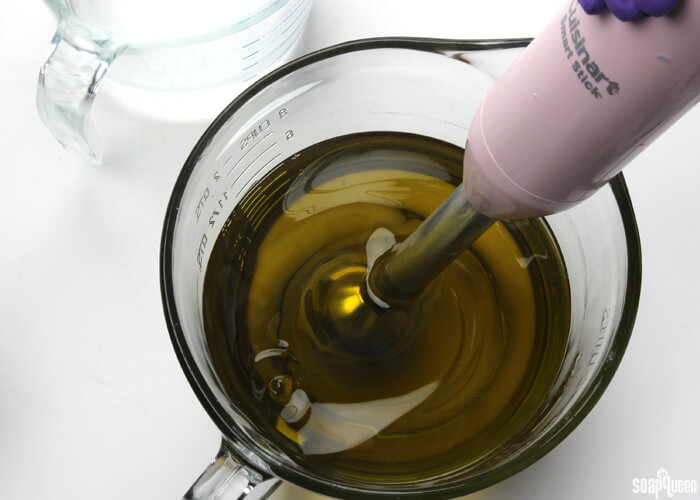 - Once bubbles are no longer rising to the surface of the oils, gentle pour the cooled lye water down the shaft of the stick blender and into the oils.
