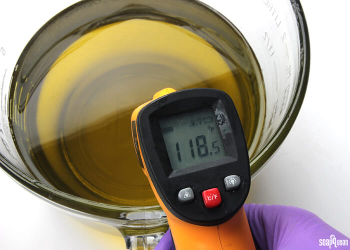 - Combine the coconut oil, olive oil and palm oil (remember to fully melt then mix your entire container of palm oil before portioning). Allow the lye water and the oils to cool to 130 degrees or below (and are ideally within 10 degrees of each other). For this recipe, both the oils and lye were around 120 degrees. If you’d like a harder bar of soap that releases faster from the mold, you can add sodium lactate to the cooled lye water. Use 1 teaspoon of sodium lactate per pound of oils in the recipe. For this recipe, you’d add about 2 tsp. sodium lactate.