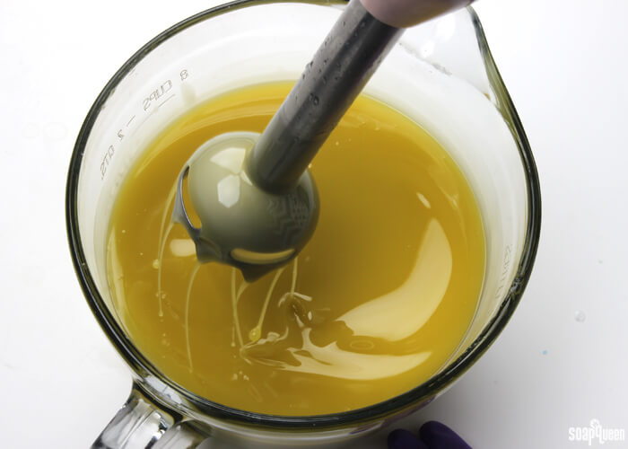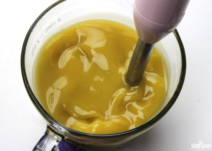 - Turn on the stick blender and pulse several times. You will immediately see the lye and oils begin to come together, and begin to create a creamy yellow color. Alternate between using the stick blender to stir the mixture, and pulsing the stick blender. After about 30 seconds, test for trace. Because this recipe contains a large amount of olive oil, it will stay at a thin trace longer than recipes with fast moving oils such as butters.