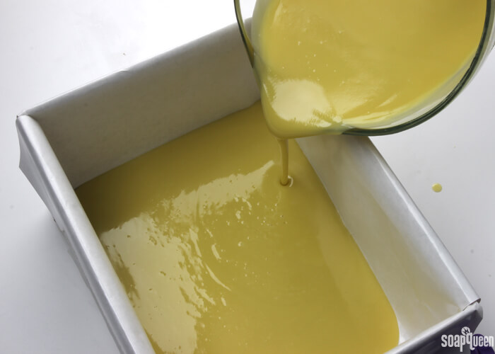 - Once your soap has reached medium trace, pour it into the mold until all the soap is in the mold. Scrape the sides of the bowl to ensure you get every last bit of soap!