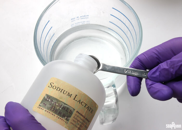 If you’d like a harder bar of soap that releases faster from the mold, you can add sodium lactate to the cooled lye water. Use 1 teaspoon of sodium lactate per pound of oils in the recipe. For this recipe, you’d add about 2 tsp. sodium lactate.
