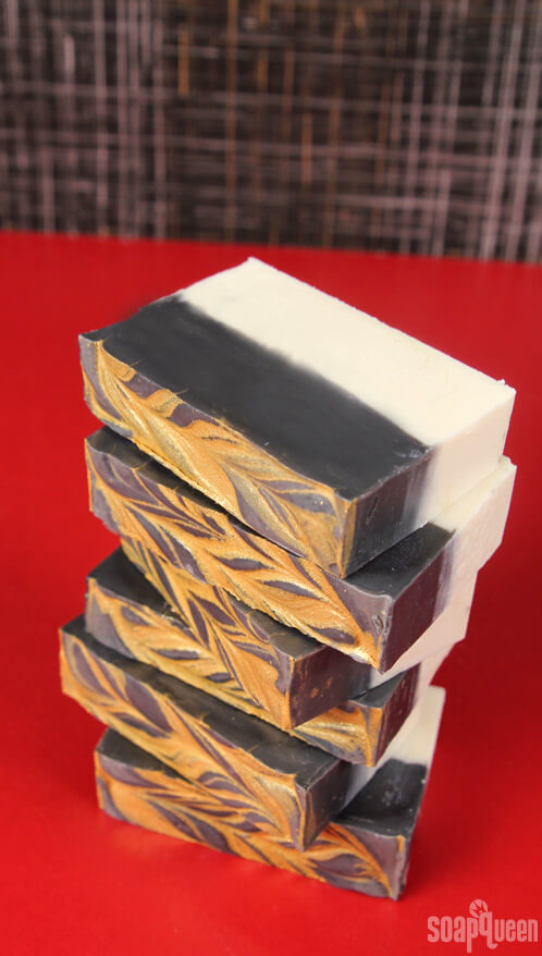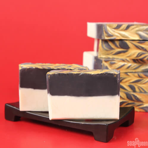 This two-layer soap features a classic black and white color scheme. The key to this technique is keeping the layers smooth and straight. The little something special in this recipe comes from the Bamboo Powder extract, which is a mild exfoliant added to the bottom white layer. This soap was finished with gold mica painting, which popped beautifully against a black background. Who says simple can’t be pretty?