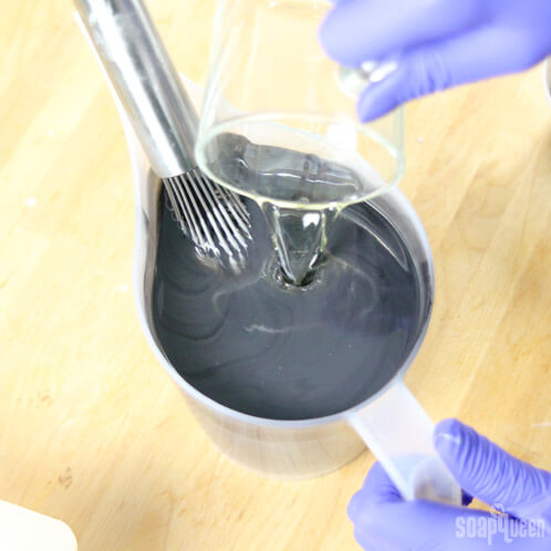 EIGHT: In the second batter container, add 1 teaspoon of dispersed Black Oxide and the remainder of the fragrance oil. Mix in with a wire whisk. You want this batter to have a slightly thinner consistency so it pours nicely over the white soap.