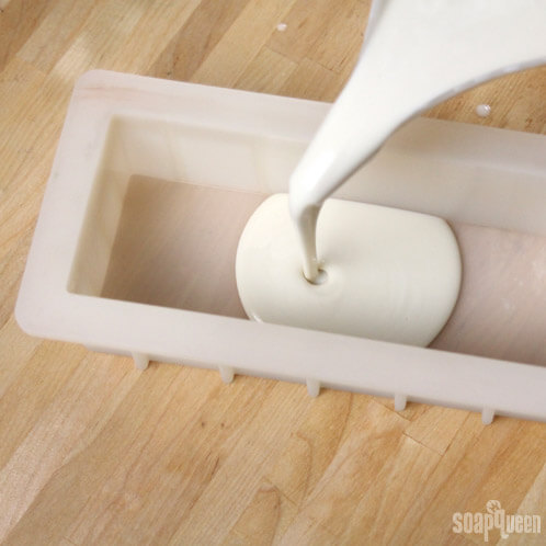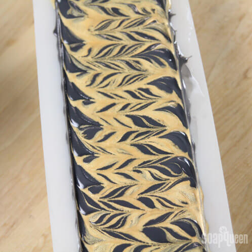 Note: Half of the soap is white in this design, which makes it a prime candidate for forming glycerin rivers. Although harmless, you can prevent glycerin rivers by soaping colder. You may want to try this recipe with your lye around 100 degrees F and your oils around 90 degrees F.