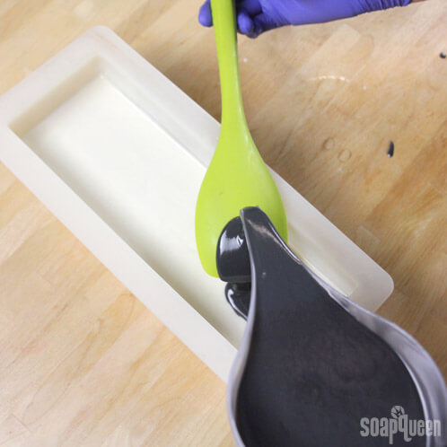 NINE: Pour the black soap over a spatula or spoon so you don’t break through the white layer below. You want a nice straight divide between the two colors, so take your time when pouring the black layer.