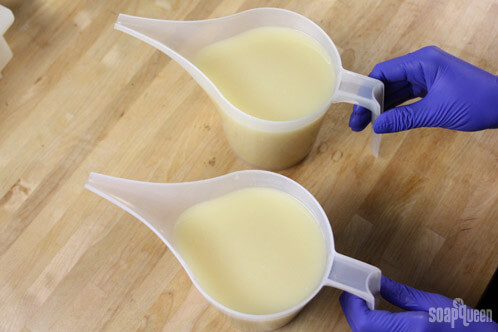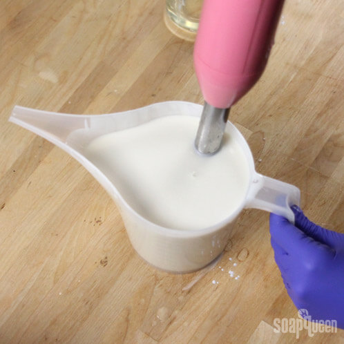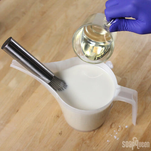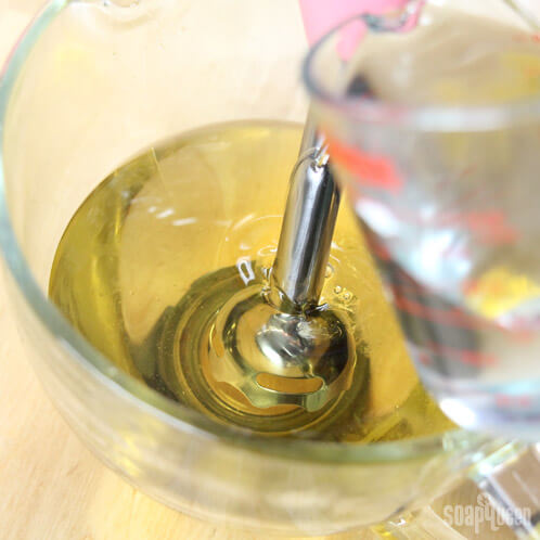 ONE: Slowly and carefully add the lye to the water and gently stir until the lye has fully dissolved and the liquid is clear. Set aside to cool.