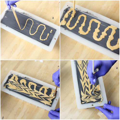 ELEVEN: Using the dropper, drizzle an S-shaped curve of dispersed Gold Sparkle Mica on top of the soap (top left and right photos). Then, drag a chopstick or dowel in an S-shaped curve length-wise across the soap (bottom left photo). Finish the design by drawing the same S-curve width-wise through the soap (bottom right photo).
